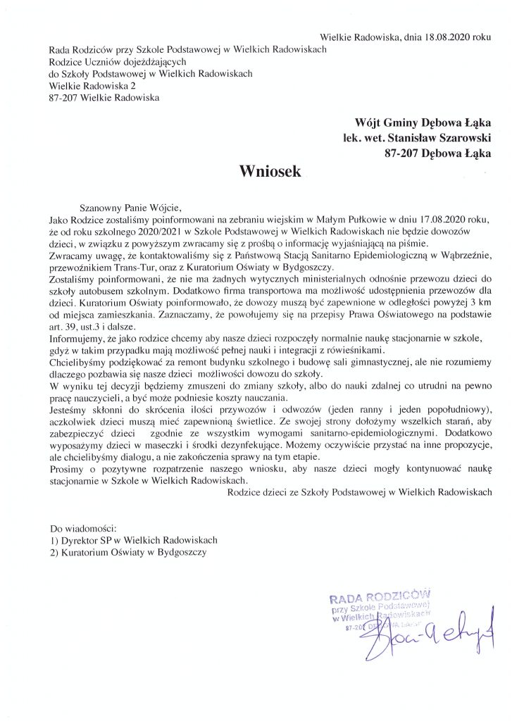 Poniżej przesyłam pismo, które zostało skierowane od Rady Rodziców w imieniu Rodziców uczniów dojeżdżających do szkoły.