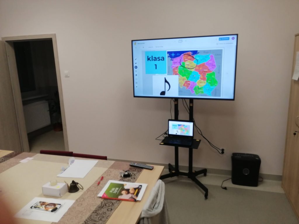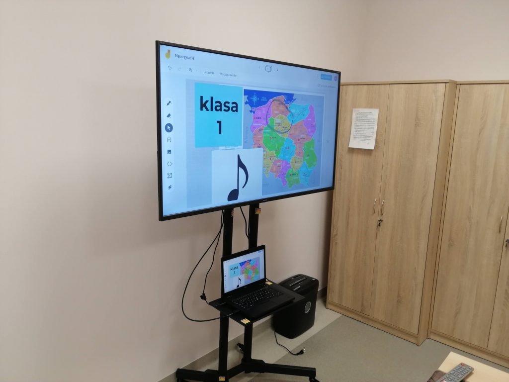 Zakupiliśmy ruchomy stojak na kółkach, który umożliwi transport telewizora do klasy w której będzie potrzebny. Pod telewizorem znajduje się półka, na ktorej znajduje się komputer podłączony do TV. Skonfigurowaliśmy Jamboard dzięki, któremu można prowadzić zajęcia na wirtualnej tablicy, a to tylko część możliwości...