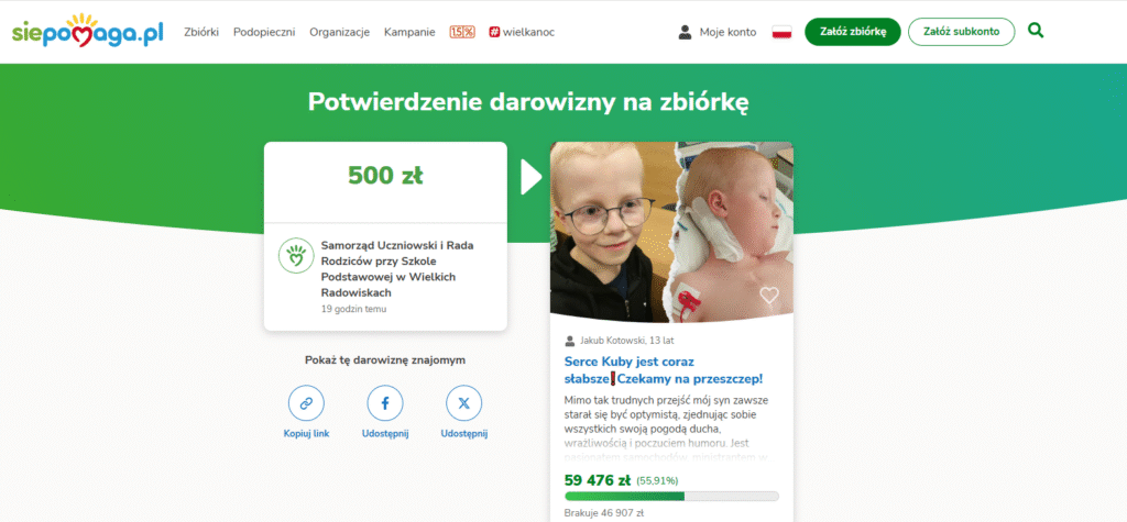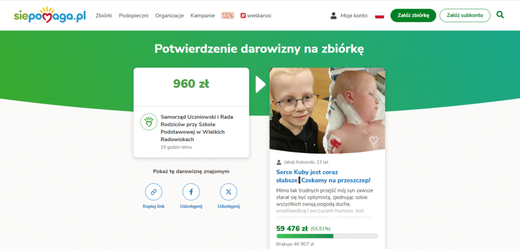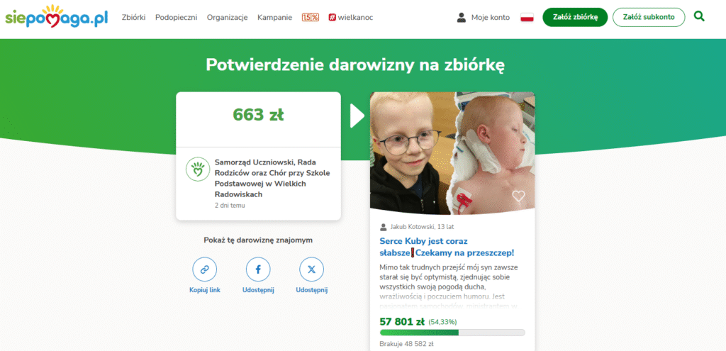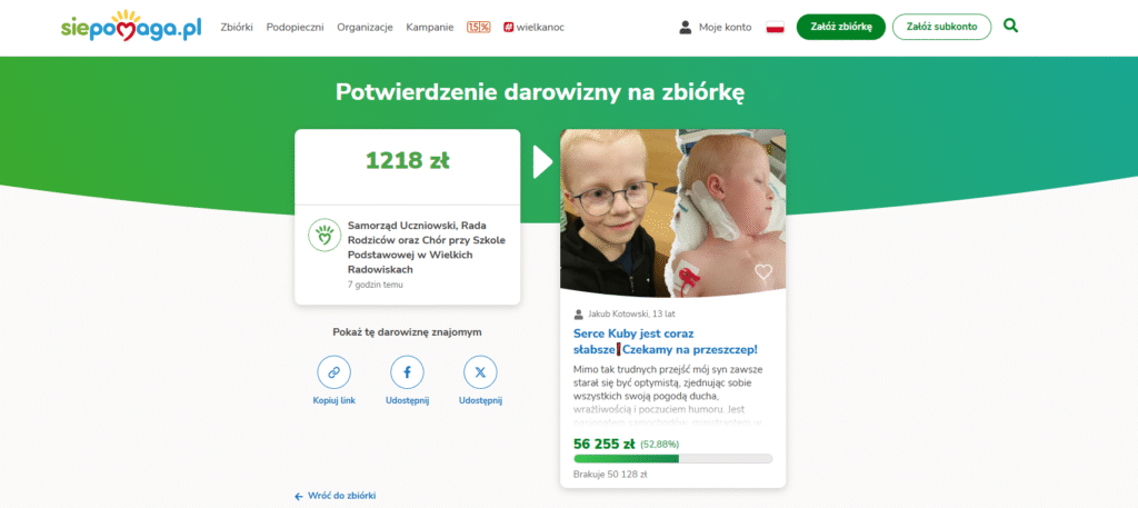Z głęboką wdzięcznością chcielibyśmy podziękować za wszystkie gesty wsparcia, które już napłynęły oraz za każde wyrażenie chęci pomocy w trudnym czasie, który przeżywa Kuba wraz z rodziną. Jakub, który obecnie przebywa w szpitalu w Warszawie, czeka na przeszczepienie serca. Wasza pomoc ma ogromne znaczenie i daje nadzieję na lepsze jutro.