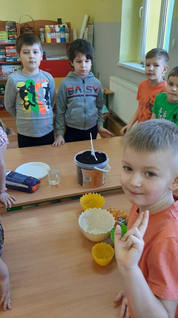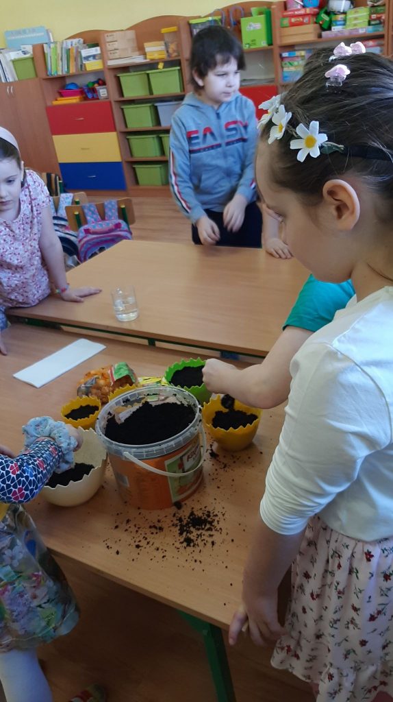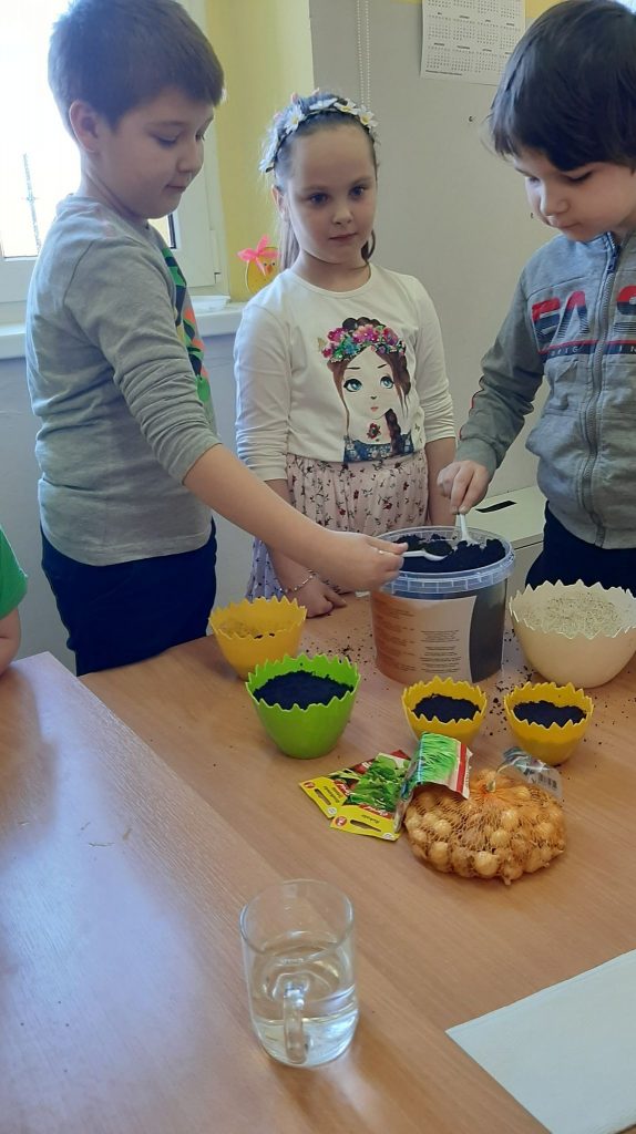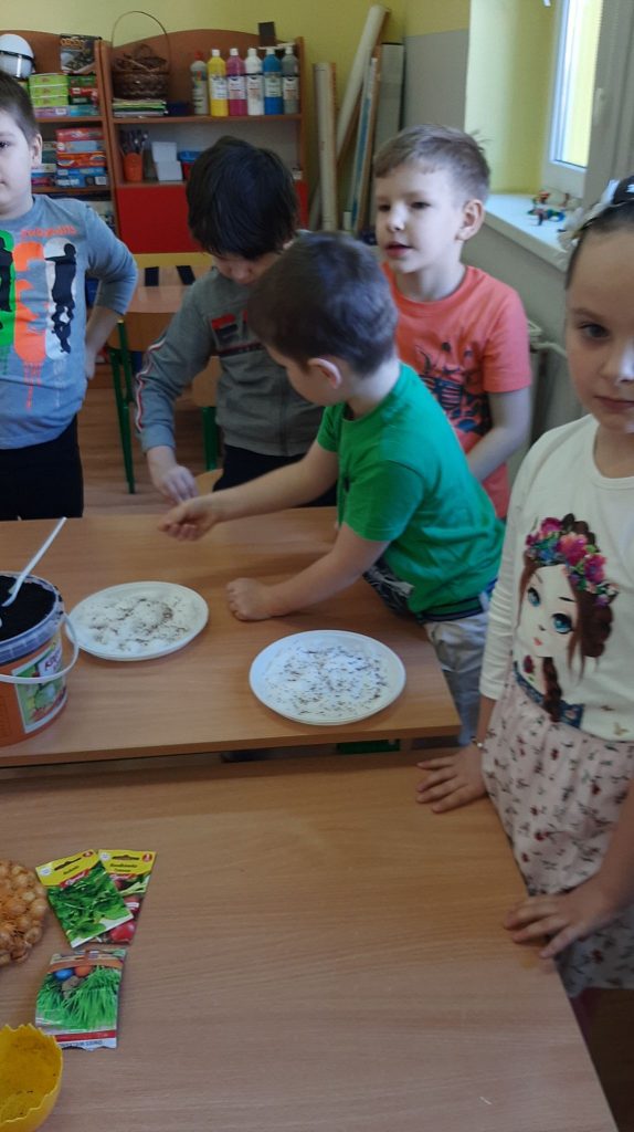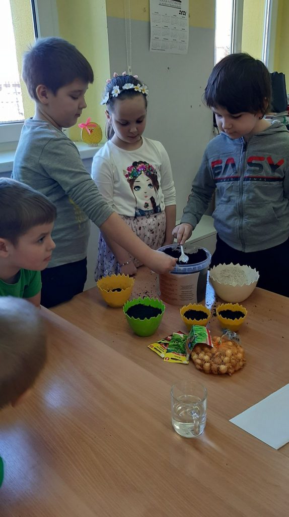 22 marca dzieci z klasy „0” od samego rana zabrały się do pracy i założyły klasowy „ogródek”. Posadziły cebulę, zasiały rzeżuchę, owies wielkanocny, rzodkiewkę oraz rukolę. Teraz prowadzą obserwację, kiedy nasiona zaczną kiełkować.