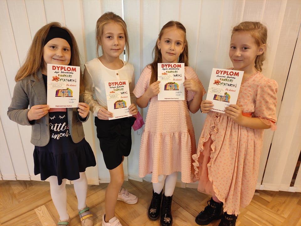 Agata Dąbrowska z klasy I oraz uczennice klasy II Zoja Błaszkowska, Zuzanna Grzębska i Patrycja Gutowska godnie reprezentowały naszą Szkołę podczas powiatowego konkursu recytatorskiego „Jan Brzechwa – dzieciom”. Organizatorem był Wąbrzeski Dom Kultury w Wąbrzeźnie.